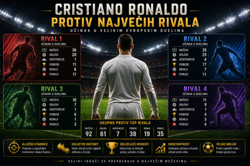 Kada se govori o najvećima u istoriji fudbala, broj golova i trofeja su samo deo priče. Pravi test dolazi u duelima protiv najjačih protivnika, u utakmicama koje odlučuju titule, Ligu šampiona i nasleđe. Upravo zato analiza Ronaldo protiv najvećih rivala daje mnogo precizniju sliku o njegovoj karijeri nego ukupna statistika.